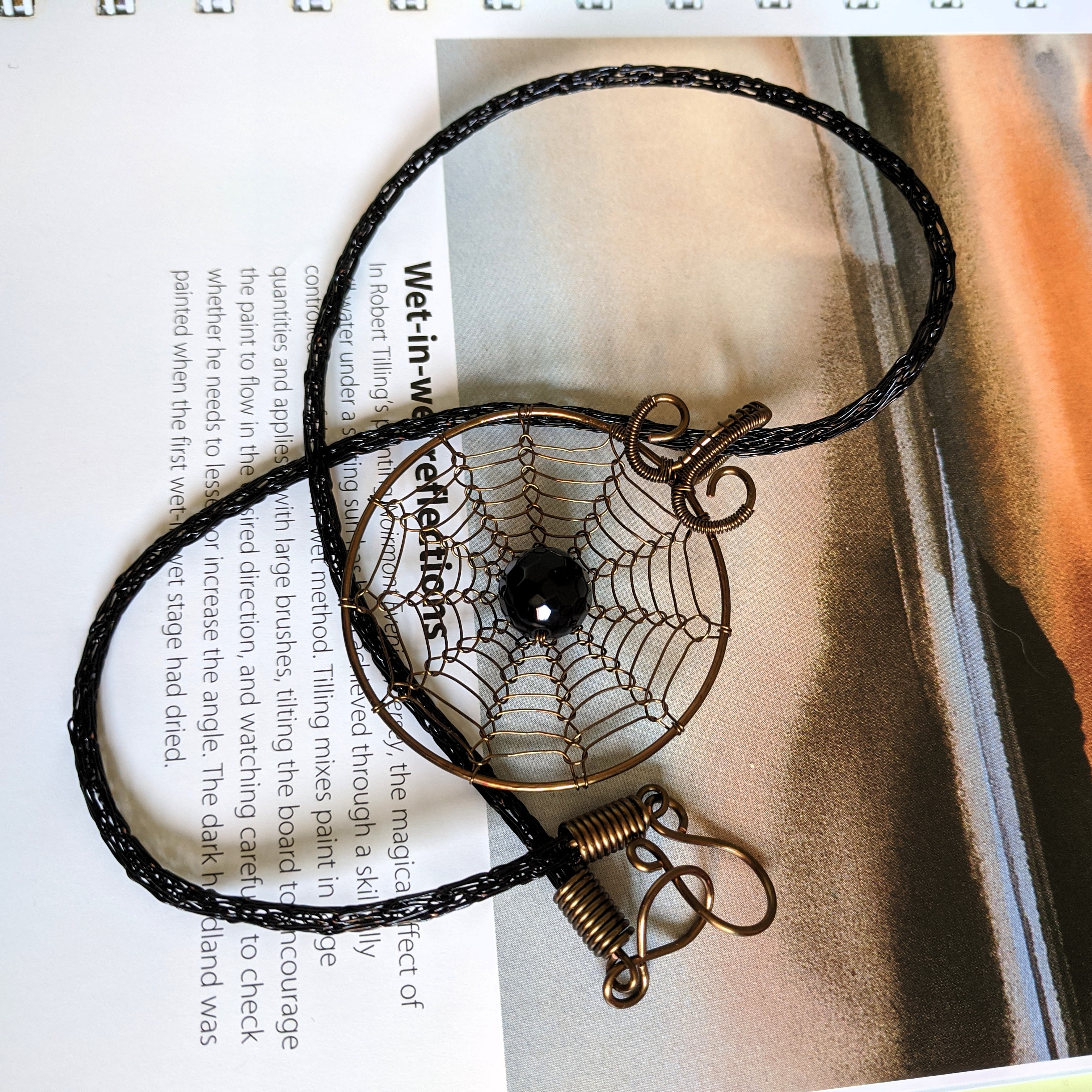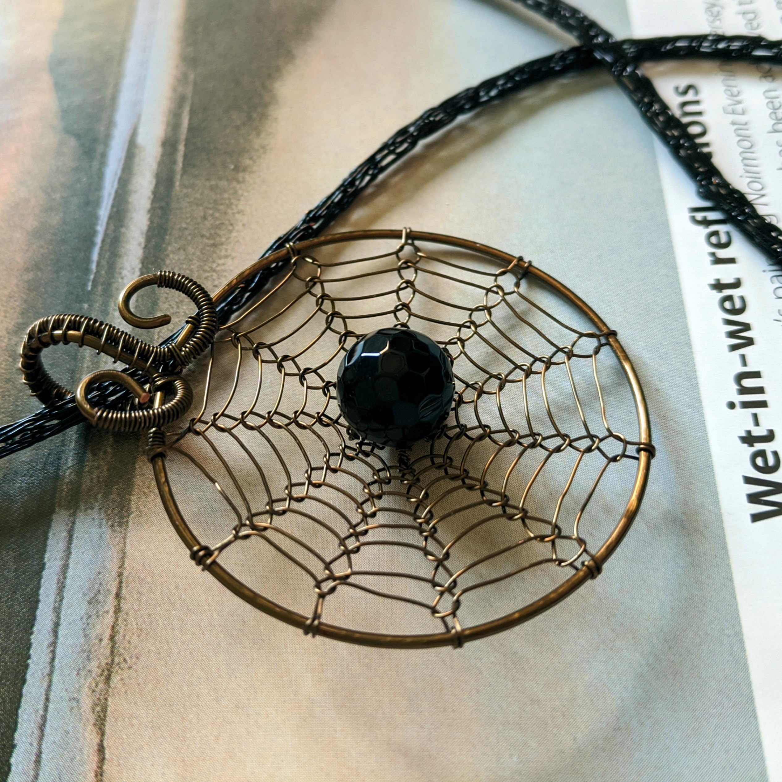 Această agată neagră stă captivă într-o pânză din sârmă de cupru, iar șnurul pandantivului este împletit în tehnica Viking Knit din sârmă de cupru cu finish negru lucios.