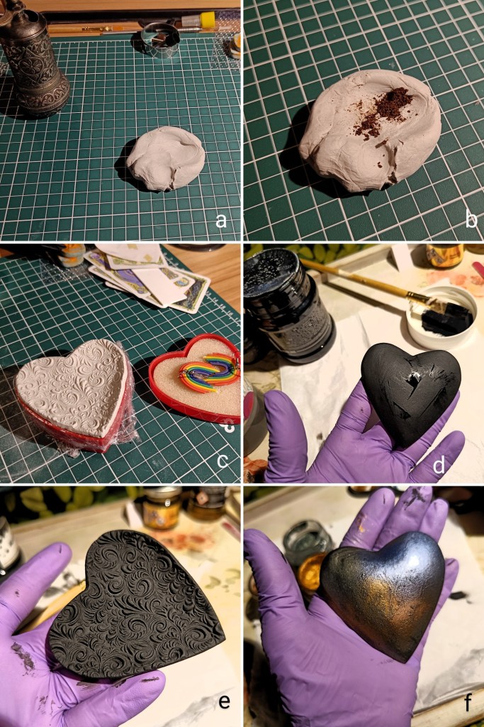 Am folosit lut cu uscare la aer (a), în care am amestecat cafea râșnită pentru a adăuga textură (b) – dat fiind că am texturat oricum lutul cu o textură de silicon (c), l-am netezit cu bureței abrazivi după uscare și l-am vopsit cu un negru opac (d, e), prezența cafelei a adăugat doar puțină savoare olfactivă la procesul de modelare.